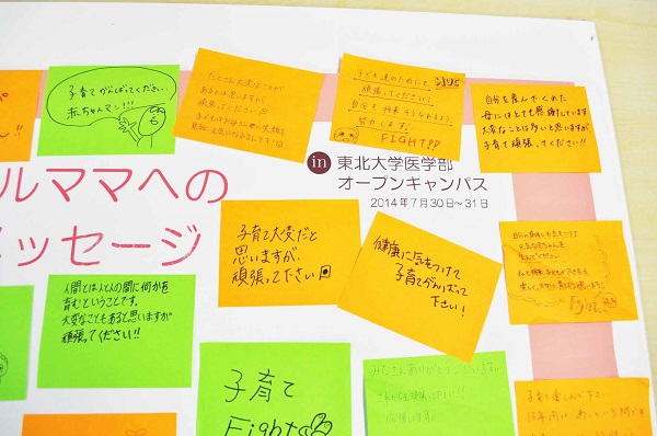 エコチル調査の活動内容のパネルの展示、DVDの視聴コーナーを設置したブースでは、エコチル調査クイズやエコチルママへの応援メッセージを書いてもらうコーナーもあり、高校生からはこんなメッセージをもらいました。