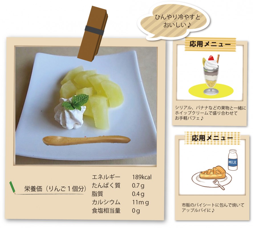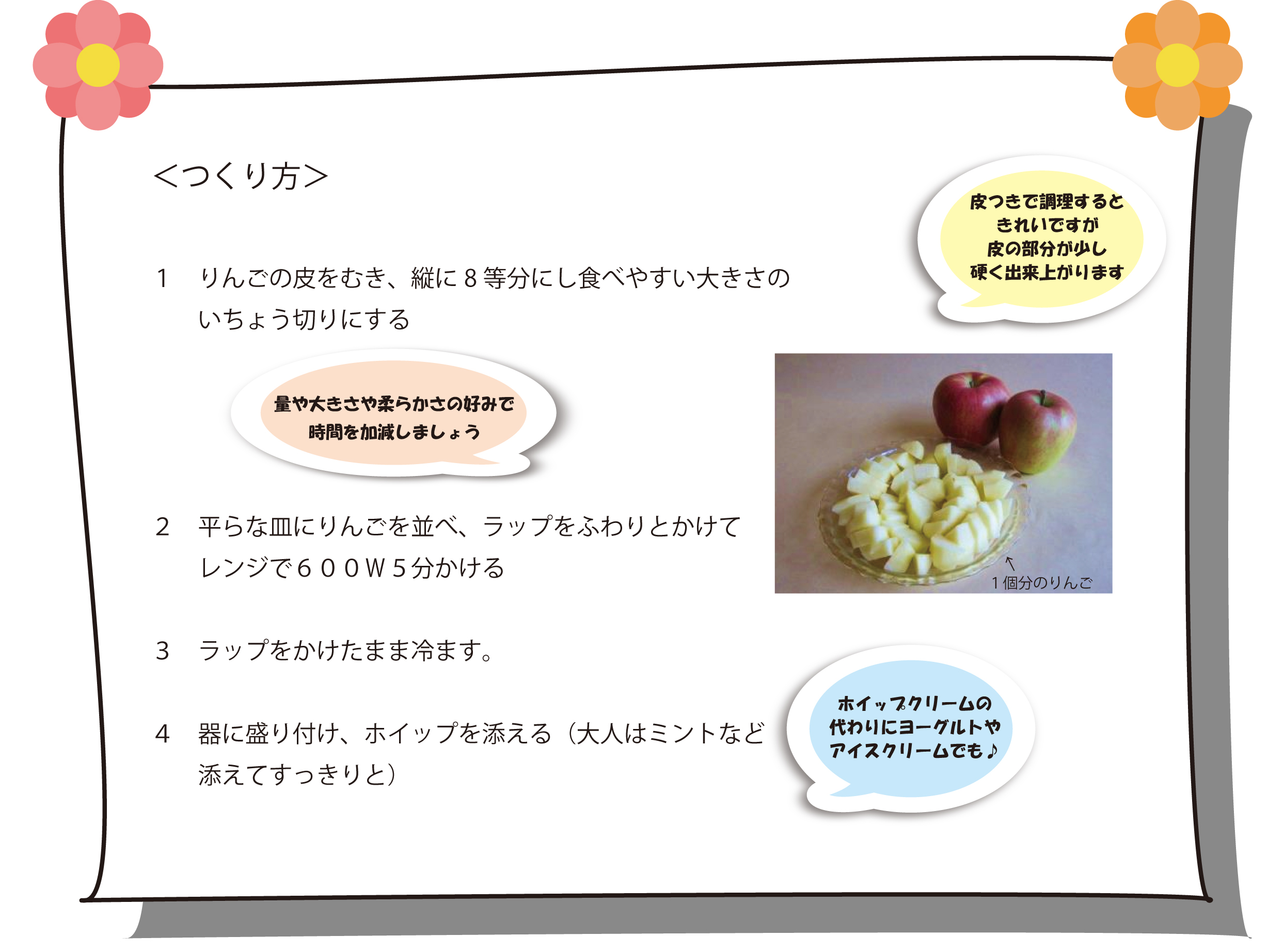 2015.11.16お料理レシピ ●レンジ りんごコンポート ◎材料 ・りんご 1個(350gくらい) ・ホイップクリーム 適宜 ■仙台市地域活動栄養士会 子供の食事研究グループさんよりレシピの提供とご協力をいただきました。 一覧へ戻る