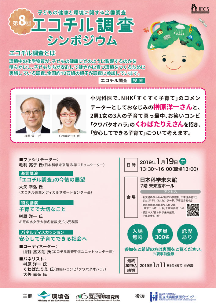 2019.01.09参加者のみなさまへ 第8回エコチル調査シンポジウムのお知らせ 2019年1月19日(土)日本科学未来館にて第8回エコチル調査シンポジウムを開催いたします。 詳細はこちら→第8回エコチル調査シンポジウム 一覧へ戻る